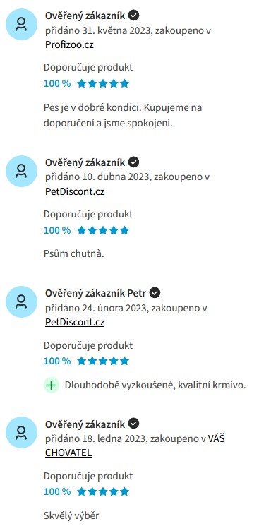 Granule pro všechna plemena, vhodné pro dospělé psy, většinovou složkou je rybí maso, 29 % proteinů, 17 % tuků.