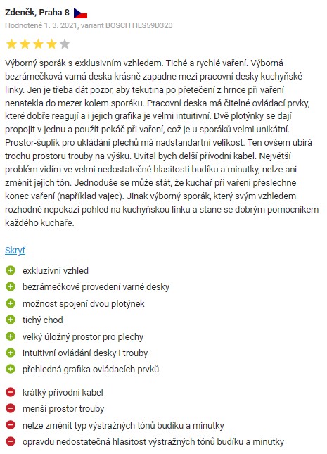 Podobně jako v případě jiných dražších modelů v našem testu indukčních sporáků není ani Bosch HLS59D320 recenzován příliš často. Několik uživatelských recenzí jsme však přece jen našli. Ty pozitivní souvisí s pěkným designem, intuitivním ovládáním, možností zasouvání ovládacích prvků, vysokým výkonem a pokrokovými funkcemi a technologiemi. Vícekrát zmiňovanými minusy jsou menší objem trouby a krátký přívodní kabel. K negativům spotřebitelé řadí i vyšší pořizovací cenu.