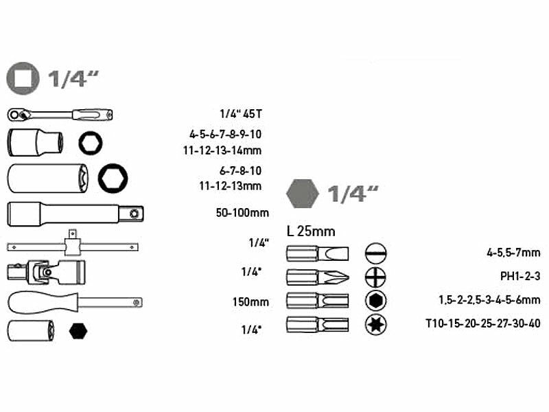 I přes menší obsah si tato sada najde své zájemce, kteří ocení právě její kompaktnost a možnost pohodlného přenášení. V kovovém kufru naleznete ráčnu 1/4", nástrčné hlavice ve velikosti od 4 do 14 mm, prodloužené nástrčné hlavice od 6 do 13 mm, prodlužovací nástavce 50 mm a 100 mm, vratidlo, univerzální kardan, šroubovák se čtyřhranem, držák na bity, bity 4-5 a 5-7 mm, PH 1-2-3, HEX 1,5-2-2,5-3-4-5-6 mm a Torx 10-15-20-25-27-30- 40. Jde vskutku o malou gola sadu, která je vhodná spíše pro jednodušší práce, sejde se vám například při opravách kol, různých elektrospotřebičů, při opravě nábytku a podobně.