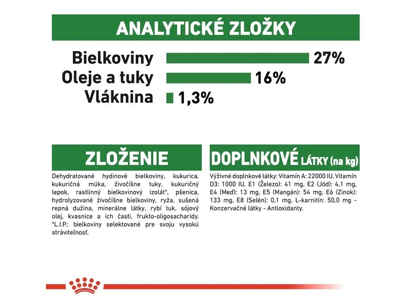 Většinová složka krmiva: kukuřice ● Energetická hodnota: 3 974 kcal/kg ● Grain free: ne ● Procento proteinů: 27 % ● Procento tuků: 16 % ● Velikost plemene: malé ● Věková kategorie psa: dospělý ● Objem balení: 8 kg ● Další složky: kukuřičná moučka, dehydratované hovězí a vepřové bílkoviny, kukuřičný lepek, řepná dužina, sójový olej, rybí tuk, bílá rýže